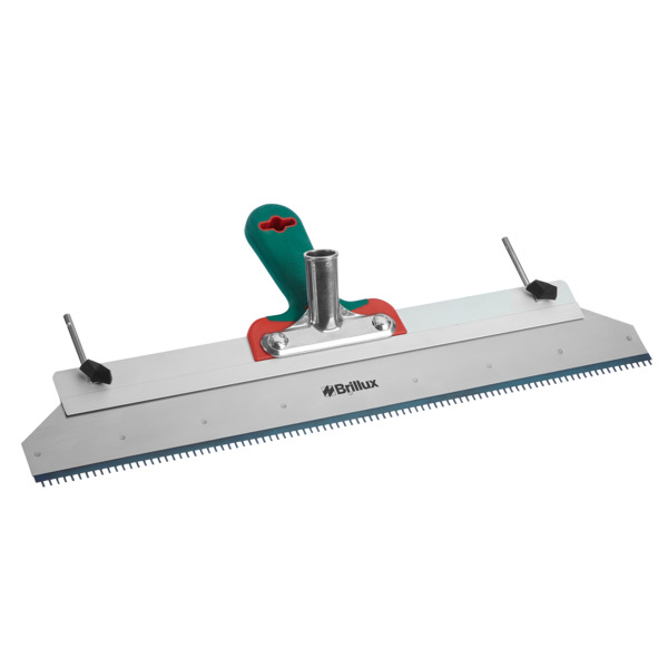 Vlakrakel voor het over grote oppervlakken verdelen van zelfverspreidende vloeregalisatiemiddelen. Met blad en opgelaste klemlijst van gehard, roestvrij veerbandstaal en twee variabel instelbare stalen pennen voor traploze hoogteverstelling.