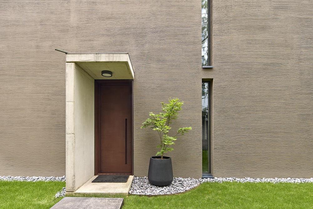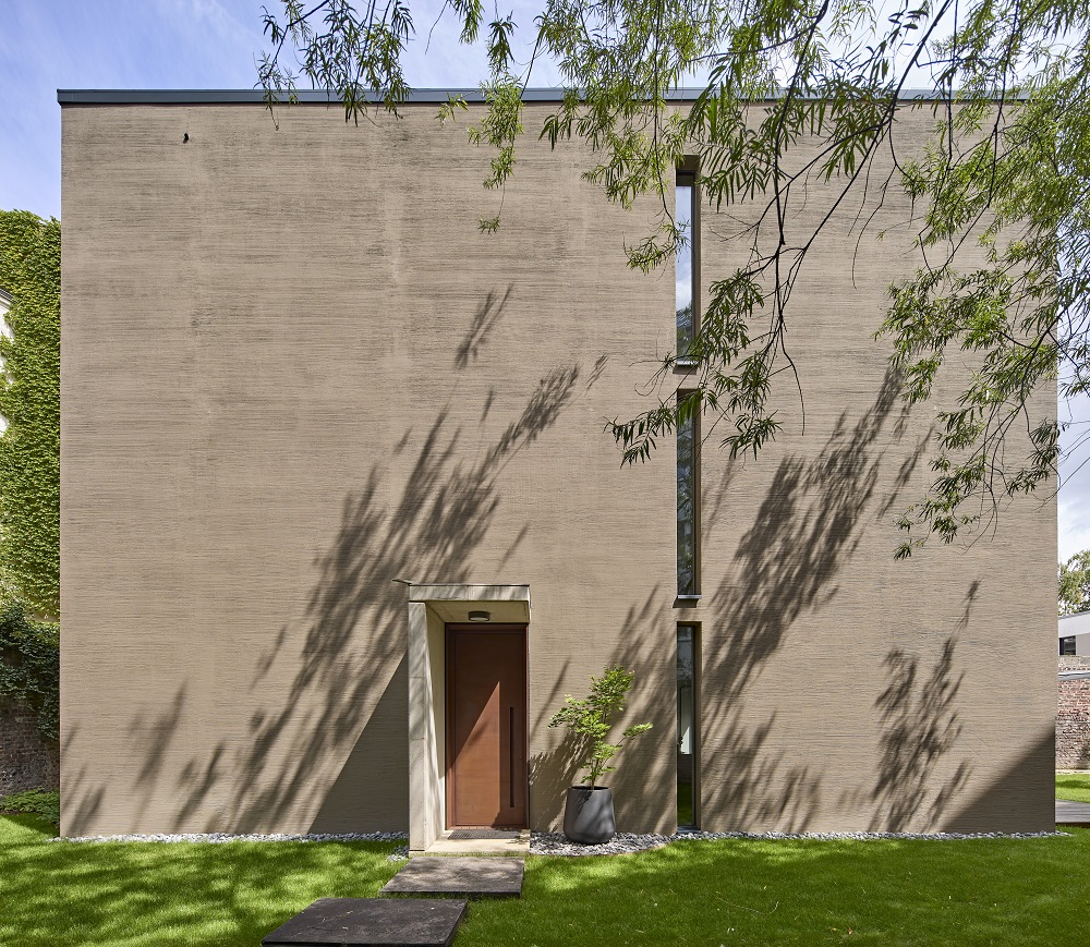 De rustige architectuurtaal leeft van harmonieuze kleuren en hoogwaardige oppervlakken. Vooral de horizontale kamstreek – uitgevoerd met Mineraal-Pleister G 3679 en afgewerkt met Siliconen-Gevelverf 918 met TSR-formule – geeft het huis een rustige, poëtische diepte. Architectuur die niet luid hoeft te zijn om effect te hebben.