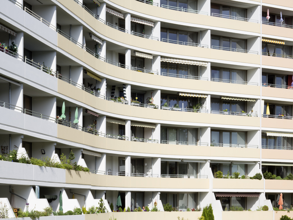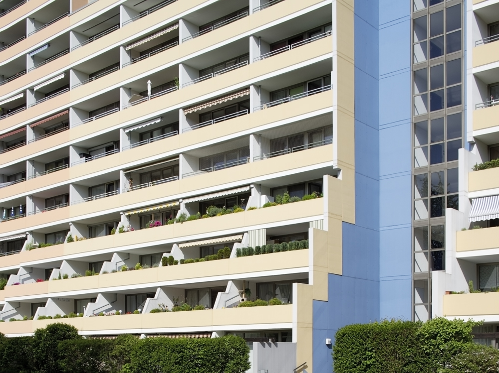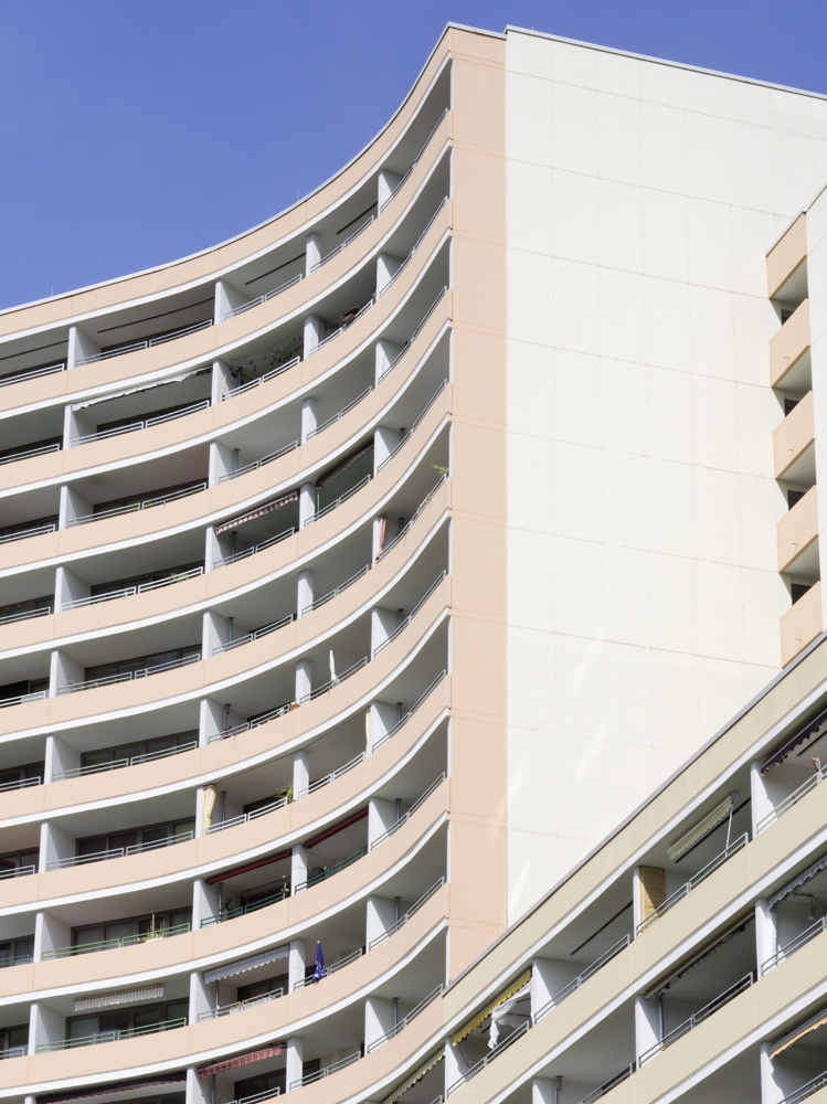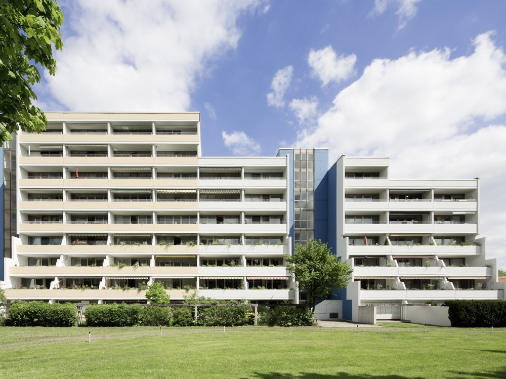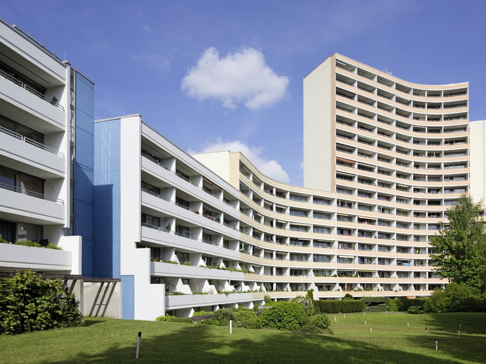 Groentinten werden bewust niet gebruikt omdat het gebouw al in het midden van een groene omgeving ligt en is omgeven door een uitgestrekt, weids park. Donkere, gewaagde kleuren en sterke contrasten voor de appartementen en balkons werden vermeden om het enorme gebouw geen te zware uitstraling te geven en vooral om de golvende architectuur niet te doorbreken. Zo blijven de afzonderlijke vleugels van het gebouw met hun verschillende hoogtes visueel één geheel vormen.