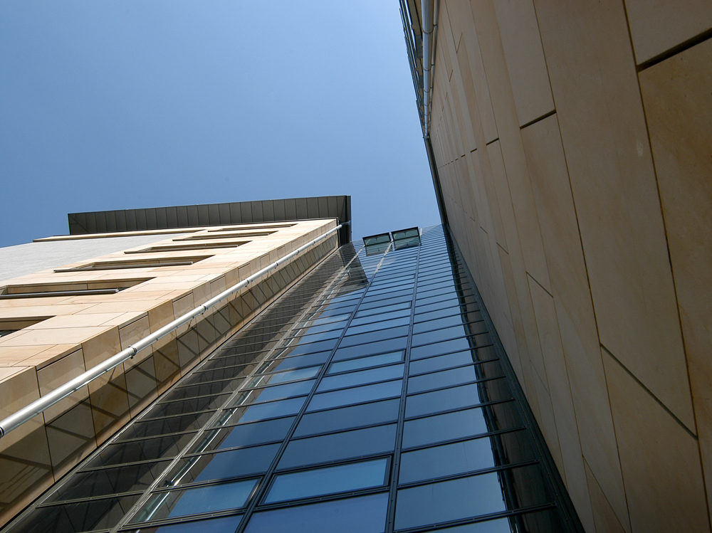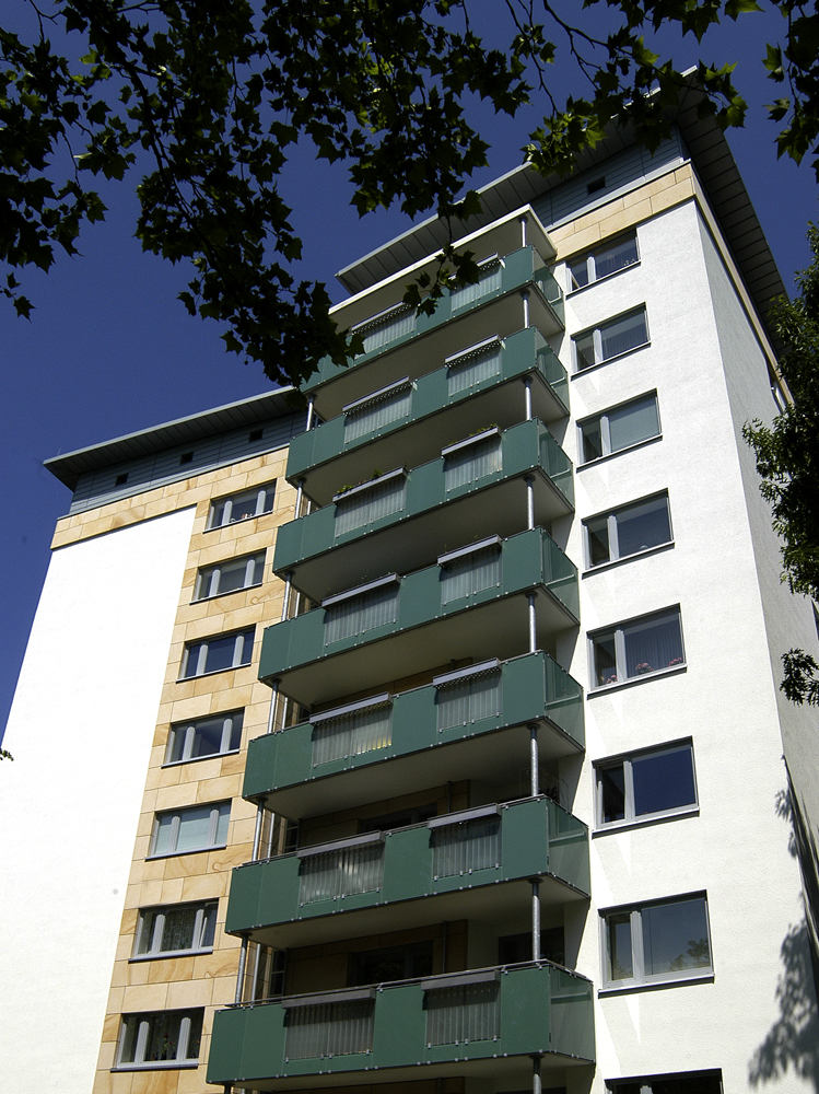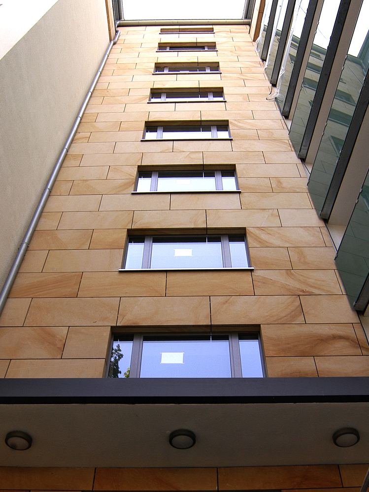 De gemengde gevel combineert een hoogwaardig systeem voor buitengevelisolatie van Brillux met een voorhanggevel uit zandsteenplaten. Dit materiaal wordt ook nog voor andere doeleinden gebruikt: bovenaan loopt een fries uit zandsteen rondom het gebouw. Samen met de iets donkerder constructies, tekent de fries de hoogte van het gebouw visueel af – ook dat is dus, als alternatief voor de donkere zones op de begane grond (zoals in het voorbeeldproject Korachstraße) – een manier om het gebouw optisch kleiner te maken. Bovendien geeft deze omlijsting met warm, iets donkerder gevelmateriaal vergeleken met de lichte crèmekleur van het geveloppervlak ook een zeer harmonieuze en sierlijke indruk.