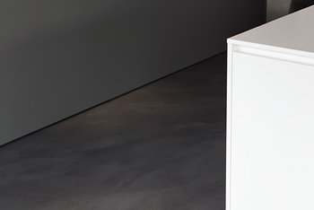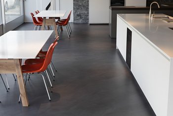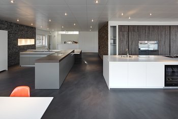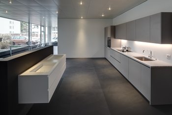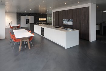 Allschwil, Zwitserland, Binningerstrasse: Floortec 2K-Mineralico SL 470 in de kleur 60.FM.09. In de showroom van decuspena zorgt de gepleisterde minerale vloer voor de perfecte bühne om te laten zien welke designmogelijkheden er zijn met moderne minerale materialen in keukens, badkamers en voor het interieur.